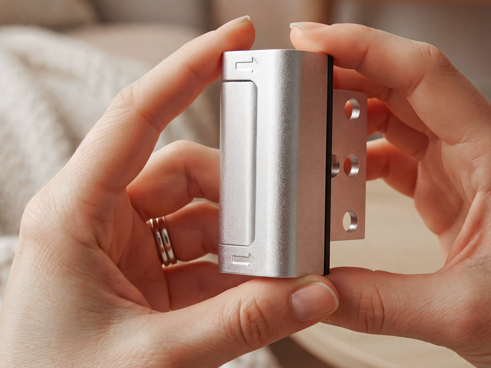 Use your thumb and forefinger to pinch both the top and bottom grooves, pull to the side and swing away from the door to open the lock. Reverse the actions to close.